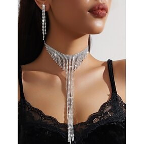 Set di gioielli da donna con strass scintillanti: collana girocollo in argento e orecchini lunghi con nappe, accessori glamour per balli serali e cocktail party