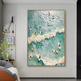 Dipinto ad olio raffigurante una veduta aerea materica di surfisti.