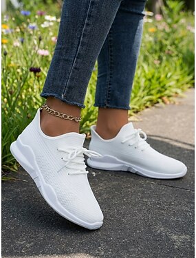 Sneakers da donna bianche in maglia: scarpe sportive leggere e traspiranti con lacci, scarpe casual da passeggio per la palestra, i viaggi e l'uso quotidiano.