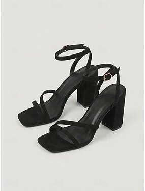 Sandali neri da donna con tacco a blocco - scarpe minimaliste con cinturino alla caviglia e punta aperta per cocktail party