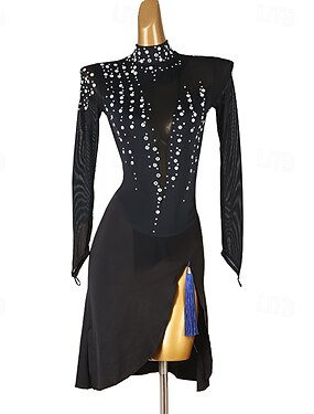 ballo salsa vestito da ballo latino nappa con strass allenamento per performance da donna e ragazza a maniche lunghe in tulle alto spandex