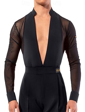Body da ballo latino da uomo con maniche in rete trasparente &camicia da gara per spettacoli di ballo da sala con scollo a V profondo