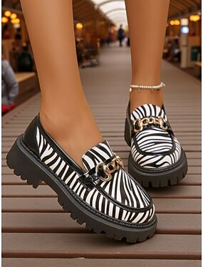 Mocassini da donna in stampa zebra - Scarpe slip-on chunky con dettaglio della catena dorata scarpe flat alla moda con stampa animale audace per abbigliamento casual streetwear e Oktoberfest