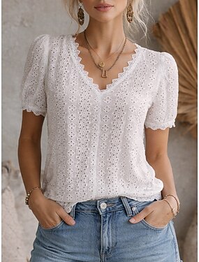 Per donna Blusa Pizzo Patchwork Tinta unica Elegante Casual Manica Corta Scollo a V Top Regolari Quotidiano Nero Bianco Estate Primavera