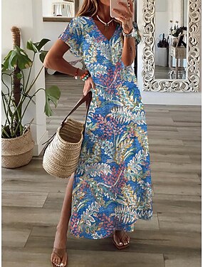 Per donna Abito maxi Abito a trapezio Casual Quotidiano Vestibilità regolare Floreale Grafico Manica Corta Scollo a V Blu Blu reale Arancione Verde Estate Primavera
