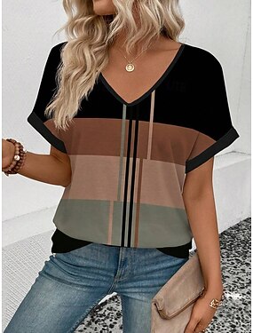 Per donna Maglietta Stampato Grafico Geometrico Vintage Elegante Classico Manica Corta Scollo a V Top Regolari Quotidiano Weekend Abbigliamento da vacanza Cammello Estate Primavera