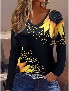 Per donna Maglietta Stampato Floreale Grafico Piante Vintage Elegante Classico Manica Lunga Scollo a V Top Regolari Quotidiano Nero Giallo Primavera Autunno