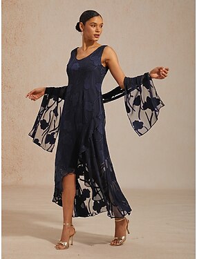 Per donna Abito maxi Abito con balze Elegante Festa serale Matrimonio Ospite di nozze Allacciato Guanto Floreale Senza Maniche Collo a U Blu marino