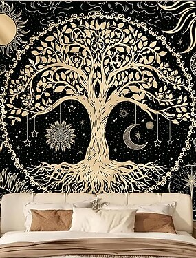 Arazzo da parete celeste con albero della vita in oro e nero, sole, luna, stelle, astrologico, mistico, boho, hippie, mandala, da appendere alla parete per camera da letto, soggiorno, dormitorio,