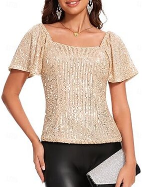 Per donna Camicia elegante Blusa Top con paillettes Glitter Tinta unica Elegante Casual Manica Corta Collo quadrato Top Regolari Feste Ferie Rosa cipria Rosa Rosso Blu marino Albicocca Estate