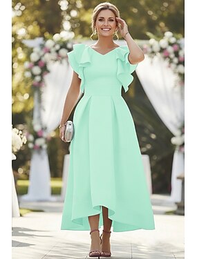 Linea ad A Asimmetrico Vestito da Festa Abito da Cocktail Abito da invitata a nozze Abito da cerimonia per signora Manica Corta Scollo a V Elegante Alto Basso Raso con Volant