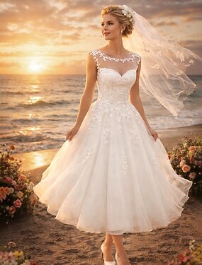 Linea ad A Lunghezza Tè Abiti da sposa Abito da sposa Vintage Anni 1940 / 1950 Piccoli Abiti Bianchi Senza Maniche Scollo Illusione Laurea Compleanno Pizzo Tulle con Applicazioni