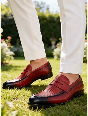 mocassini da uomo in pelle rossa: elegante design bicolore con dettagli alla moda, perfetti per matrimoni, eventi formali e occasioni speciali