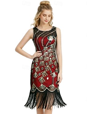 Anni Ruggenti Anni 1920 Lunghezza al ginocchio Vestito Abito Flapper Costume di fantasia Taglie Forti Senza maniche Il grande Gatsby Charleston Paillettes Frangia con nappe Piuma Scollo a V Costume