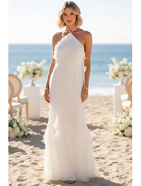 Tubino Colonna Lunghezza al pavimento Abito Bianco Piccolo vestito bianco Elegante Senza Maniche All'americana Matrimonio San Valentino Senza schiena con Volant