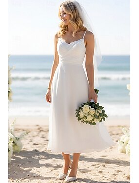 Linea ad A Lunghezza Tè Abito Bianco Abiti da sposa Abito da sposa Piccoli Abiti Bianchi Senza Maniche Scollo a V Laurea Compleanno con Arricciato Farfalla Tinta unita