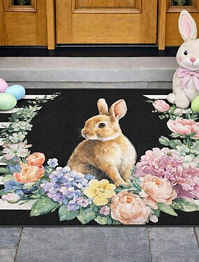 Zerbino pasquale con coniglietto circondato da una ghirlanda floreale in fiore su strisce bianche e nere, perfetto zerbino di benvenuto primaverile