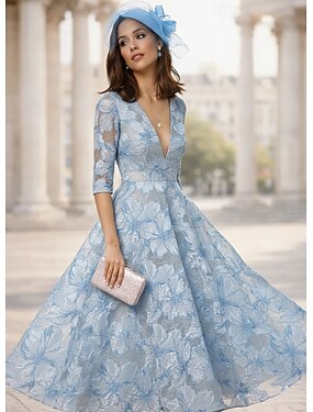 Vestiti da cocktail A-Line Abito elegante Ospite di matrimonio Vacanza Lunghezza tè Maniche corte Collo tondo Pizzo con pizzo floreale