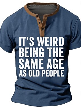 T-shirt grafica da uomo con bottone "È STRANO AVER LA STESSA ETÀ DEGLI ANZIANI" Citazione a maniche corte Verde Oliva