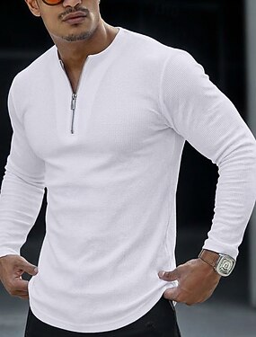 Per uomo Maglietta Waffle Maglietta Manica Lunga Zip a un quarto Primavera Autunno Tutte le stagioni Tinta unica Testurizzato Quotidiano Retrò Casual Con zip Casuale All'aperto Streetwear Nero Bianco