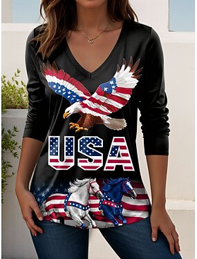Giorno dell'Indipendenza Maglietta Patriottica da Donna Grafica Lettera Vintage Elegante Classico Manica Lunga V Collo Regolari Top Da Giorno Stampa Nera Primavera Autunno