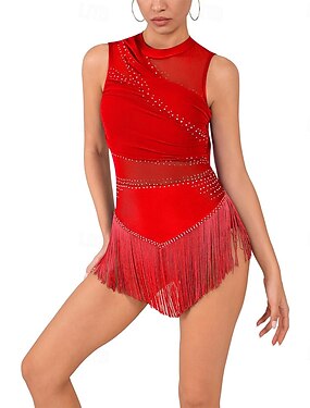 Abbigliamento da ballo latino-americano da donna, rosso: body senza maniche in rete trasparente con strass e orlo con frange ritmiche per balli da sala. &competizione