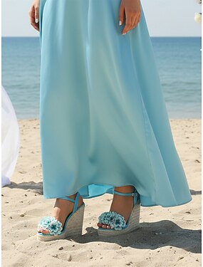 sandali con zeppa floreali azzurri da donna, scarpe eleganti aperte con cinturino alla caviglia per damigelle d'onore ai matrimoni in spiaggia