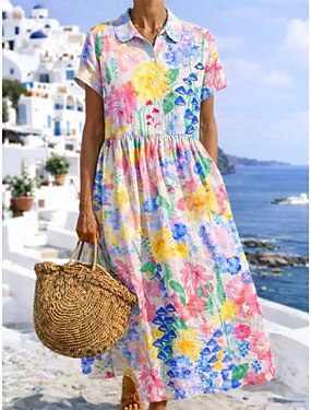 Per donna Abito Midi Abito Boho Misto lino Abito Camicia Vestito Estivo Elegante Bohemien Etnico Spiaggia Ferie Vestibilità comoda Floreale Grafico Manica Corta Colletto a Camicia Blu Rosa Arancione