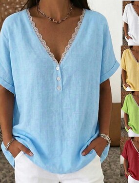 Per donna Blusa Camicia in finto lino Pizzo Patchwork Bottoni Tinta unica Elegante Casual Manica Corta Scollo a V Top Regolari Quotidiano Blu Bianco Giallo Rosso Verde Estate Primavera