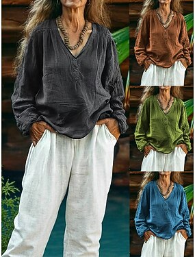 Per donna Blusa Finto cotone e lino Bottoni Tinta unica Elegante Casual Manica Lunga Girocollo Top Regolari Quotidiano Blu Nero Viola Verde Cachi Estate Primavera Autunno