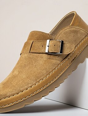 mocassini da uomo in camoscio color cuoio con fibbia, scarpe casual slip-on, calzatura comoda in stile retrò per l'uso quotidiano, l'ufficio, i viaggi, gli outfit del fine settimana, lo stile smart casual e business casual.
