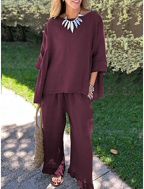 Per donna Set di Pantaloni Finto cotone e lino Manica 3/4 Girocollo Tinta unica Elegante Moda Streetwear Casuale Quotidiano All'aperto Nero Bianco Giallo Estate Vestibilità regolare