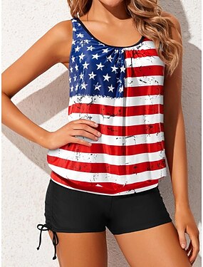 costume da bagno da donna per il giorno dell'indipendenza americana, tankini, 2 pezzi, vita alta, senza schienale, abbigliamento da spiaggia per le vacanze, geometrico, scollo a U, senza maniche