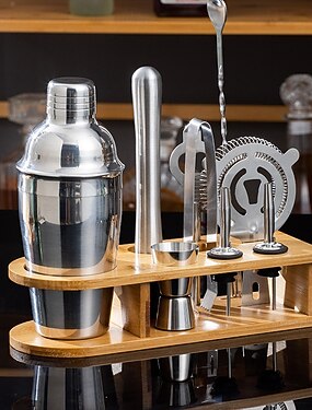 set di shaker per cocktail, kit da barista con supporto, 10 pezzi, shaker per cocktail in acciaio inox da 550 ml, set di utensili da bar con elegante supporto in bambù, kit perfetto per baristi a casa e set di shaker per cocktail Martini