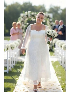 Linea ad A Lunghezza Tè Piccolo vestito bianco Elegante Floreale Manica Lunga Scollo a Cuore Matrimonio Ricevimento di nozze Tulle con Ricamo
