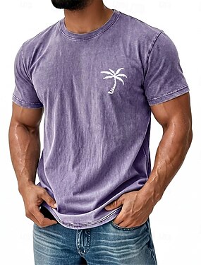 T-shirt vintage da uomo viola acid wash con palma, girocollo, maniche corte, stile tropicale per vacanze estive al mare, regalo per lui, abbigliamento firmato.