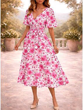 Pasqua Per donna Abito Midi Abito a trapezio Vestito a fascia Abito con balze Vacanza Casual Manica del polsino svasato Ferie Data Vestibilità regolare Floreale Grafico Manica Corta Scollo a V Rosa