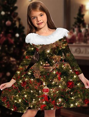 Natale ragazze' 3D Grafico Albero di Natale Fiocco di neve Abito Manica Lunga Primavera Autunno Vacanza Quotidiano Ferie Bello Dolce Bambini 4-12 Anni Vestito da Festa Abito a trapezio Lunghezza al