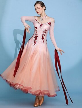 abito da ballo da sala elegante da donna con applicazioni floreali in strass, abito da competizione per valzer, tango, rumba moderna, bordeaux