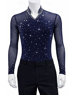 Maglia da pattinaggio artistico Per uomo Pattinaggio sul ghiaccio Top blu navy Patchwork Elasticizzato Allenamento Competizione Vestiti da pattinaggio sul ghiaccio Classico Cristallo / Strass Manica