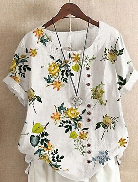Per donna Camicie di cotone e lino Blusa Finto cotone e lino Bottoni Stampato Fiore Vintage Essenziale Casual Manica Lunga Girocollo Top Regolari Quotidiano Uscire Nero Bianco Marrone chiaro Marrone