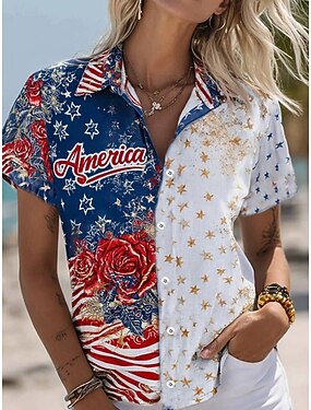 Camicia da donna per il giorno dell'Indipendenza Americana a maniche corte con grafica della bandiera vintage casual colletto regolare top quotidiano bianco estate primavera