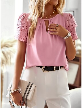 Per donna Camicia Blusa Pizzo Tinta unica Essenziale Casual Mezza Manica Girocollo Top Regolari Quotidiano Lavoro Ospite di nozze Bianco Estate Primavera