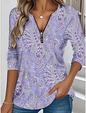Per donna Maglietta Cerniera Stampato Grafico Tribale Vintage Bohemien Tropicale Hawaiano Manica Lunga Scollo a V Top lunghi Quotidiano Uscire Weekend Rosa Viola Estate Primavera