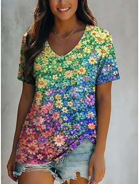 Per donna Maglietta Stampato Floreale Grafico Elegante Casual Manica Corta Scollo a V Top Regolari Quotidiano Blu Estate Primavera