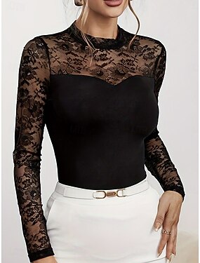 Per donna Top con cuciture in pizzo Blusa Pizzo Patchwork Semplice Elegante Sexy Classico Manica Lunga Collo Alto Top Regolari Quotidiano Ferie Uscire Nero Estate Primavera