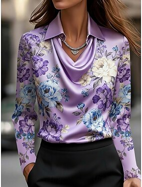 Per donna Camicia Elegant Top in raso A calotta di seta Stampato Drappeggiato Floreale Grafico Elegante Casual Manica Lunga Scollo a Cascata Top Regolari Quotidiano Lavoro Ferie Nero Bianco Viola