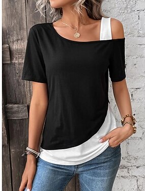 Per donna Maglietta Blocco di colori Classico Casual Manica Corta Monospalla Top Regolari Quotidiano Uscire Weekend Bianco e nero Nero e grigio Rosa Estate Primavera