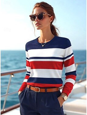 Per donna Maglietta Stampato A strisce Grafico Geometrico Oceano Vintage Moda Elegante Manica Lunga Girocollo Top Regolari Quotidiano Blu marino Estate Primavera