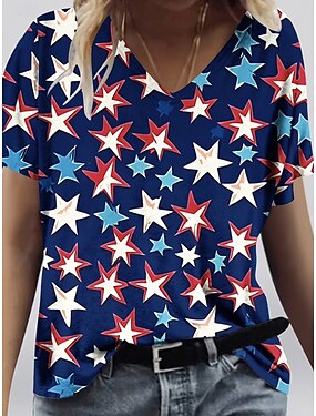 Giorno dell'Indipendenza Americana Per donna Maglietta Stampato Ombre Grafico Stella Vintage Elegante Classico Manica Corta Scollo a V Top Regolari Quotidiano Blu Estate Primavera